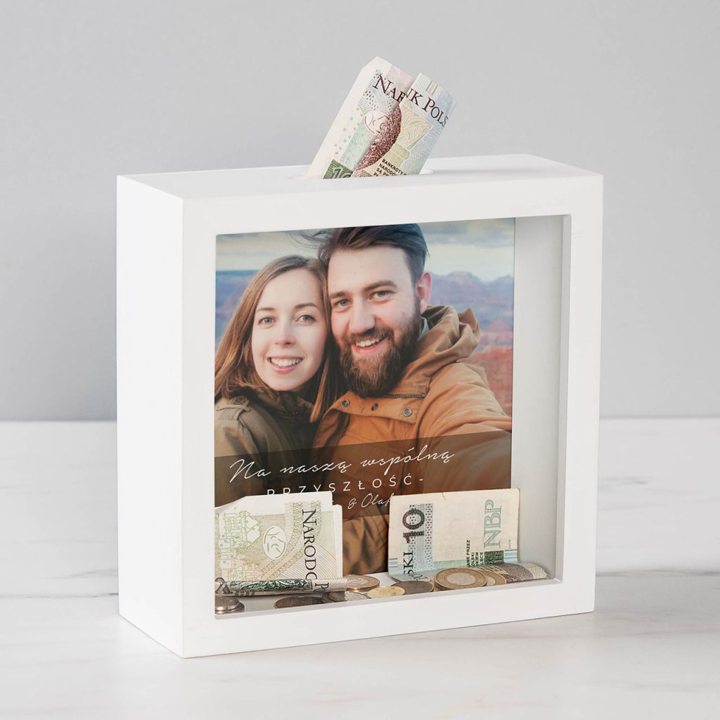 Być może odrobinę tylko mniej elegancka, ale z pewnością także ozdobna i praktyczna jest skarbonka dla dwojga NA WSPÓLNĄ PRZYSZŁOŚĆ. W przypadku niektórych par ślub nie zmienia niczego, bo i tak już od jakiegoś czasu prowadzą wspólne życie. W przypadku innych – zmienia absolutnie wszystko. Jednym i drugim na pewno jednak przydadzą się wspólne oszczędności. Na nowe mieszkanie, na budowę domu, na wyjazd zagraniczny, a nawet na spokojniejszą emeryturę… Niezależnie od wybranego celu, z personalizowaną skarbonką oszczędzanie będzie przyjemniejsze!